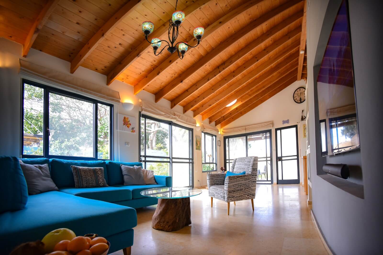 סלון מואר עם תקרה מעץ ועיצוב חמים